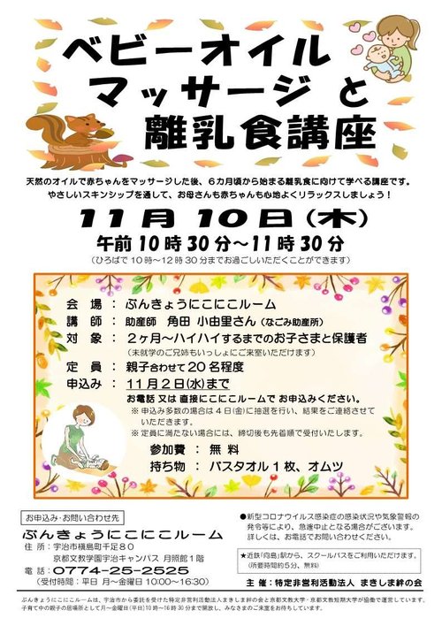 2022年11月「ベビーオイルマッサージと離乳食講座」開催のお知らせ