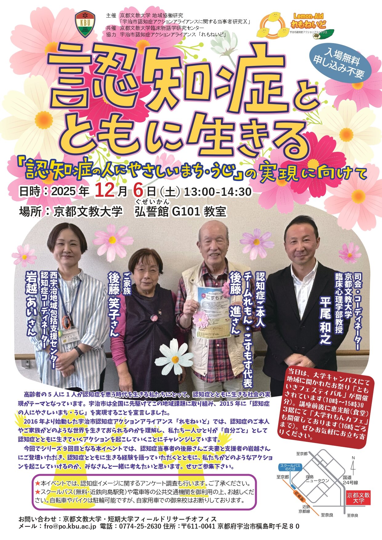 京都文教大学 地域協働教育研究 「宇治市認知症アクションアライアンスに関する当事者研究Ⅹ」主催、宇治市認知症アクションアライアンス「れもねいど」協力イベントが12月6日(土)に開催されます。当イベントには京都文教大学臨床物語学研究センターも共催の形で参加させていただいています。