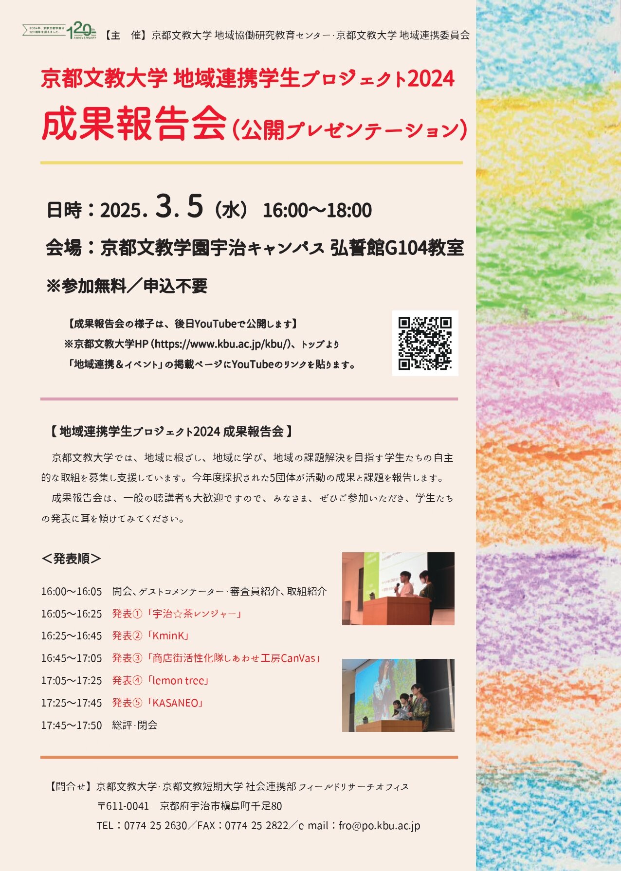 【参加募集】京都文教大学地域連携学生プロジェクト2024成果報告会(公開プレゼンテーション)の開催について