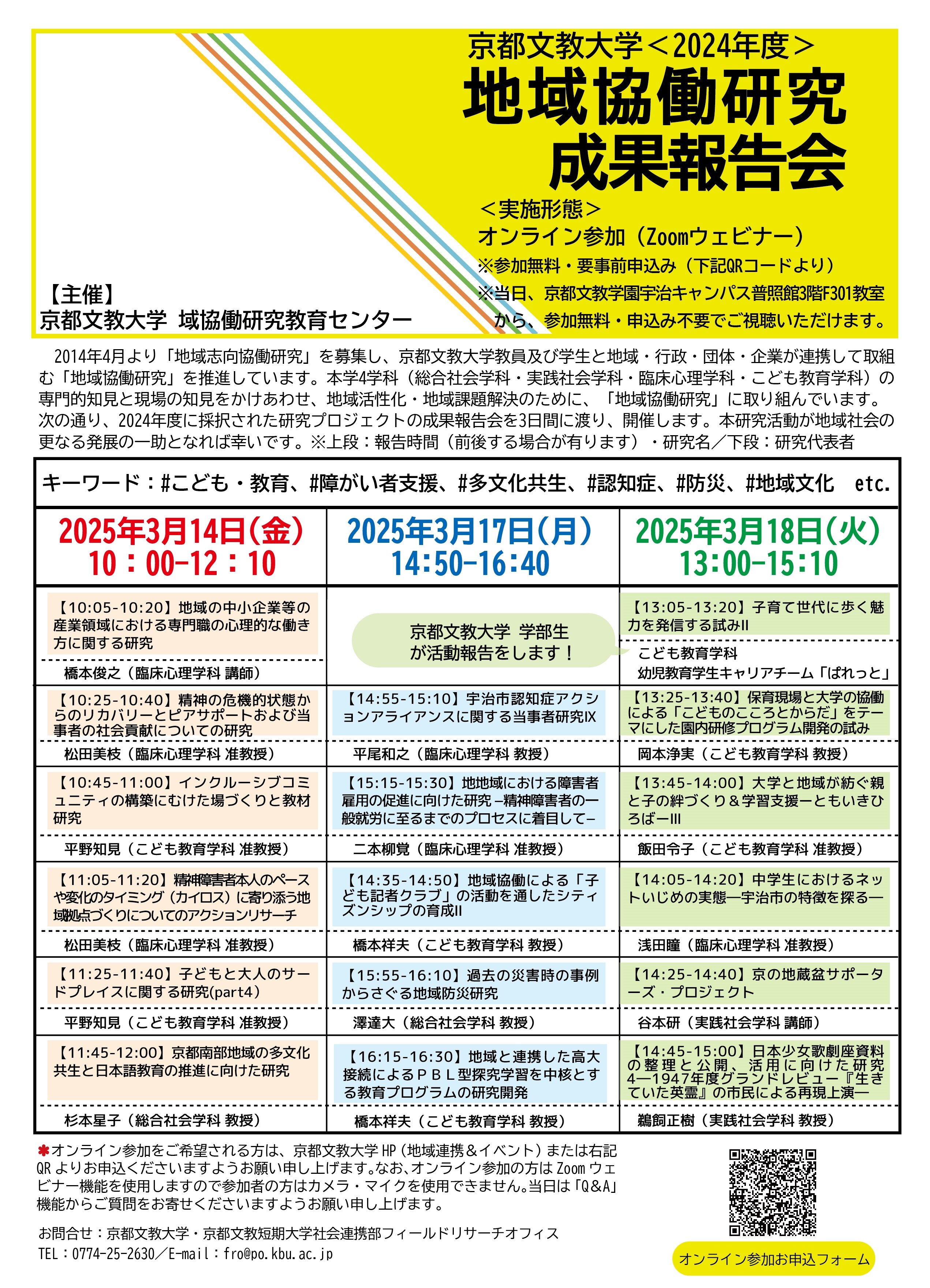 【参加募集】3/14(金)3/17(月)3/18(火)2024年度京都文教大学「地域協働研究 成果報告会」
