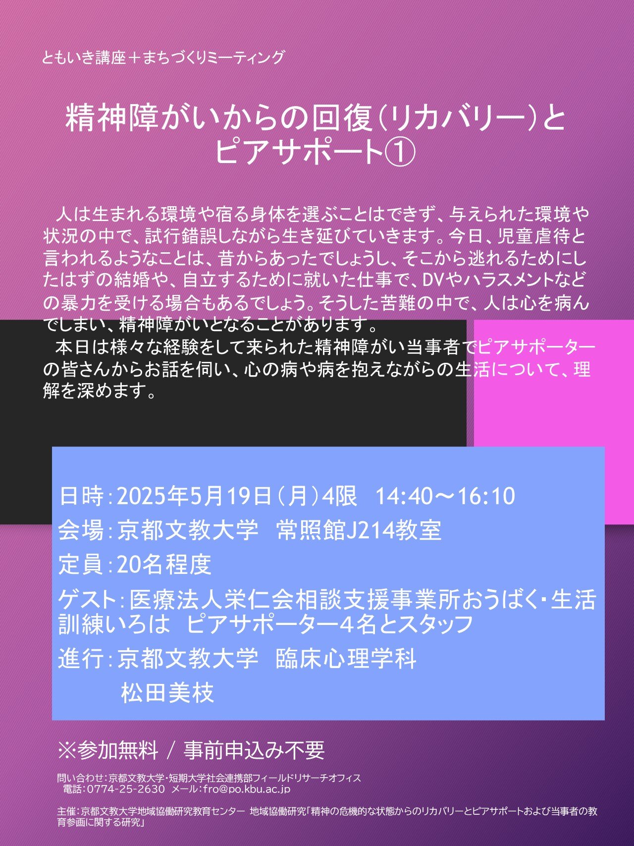 公開講座等【参加募集】5/19精神障がいからの回復(リカバリー)と ピアサポート①