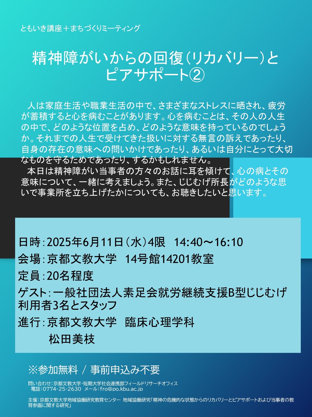 公開講座等【参加募集】6/11精神障がいからの回復(リカバリー)と ピアサポート②