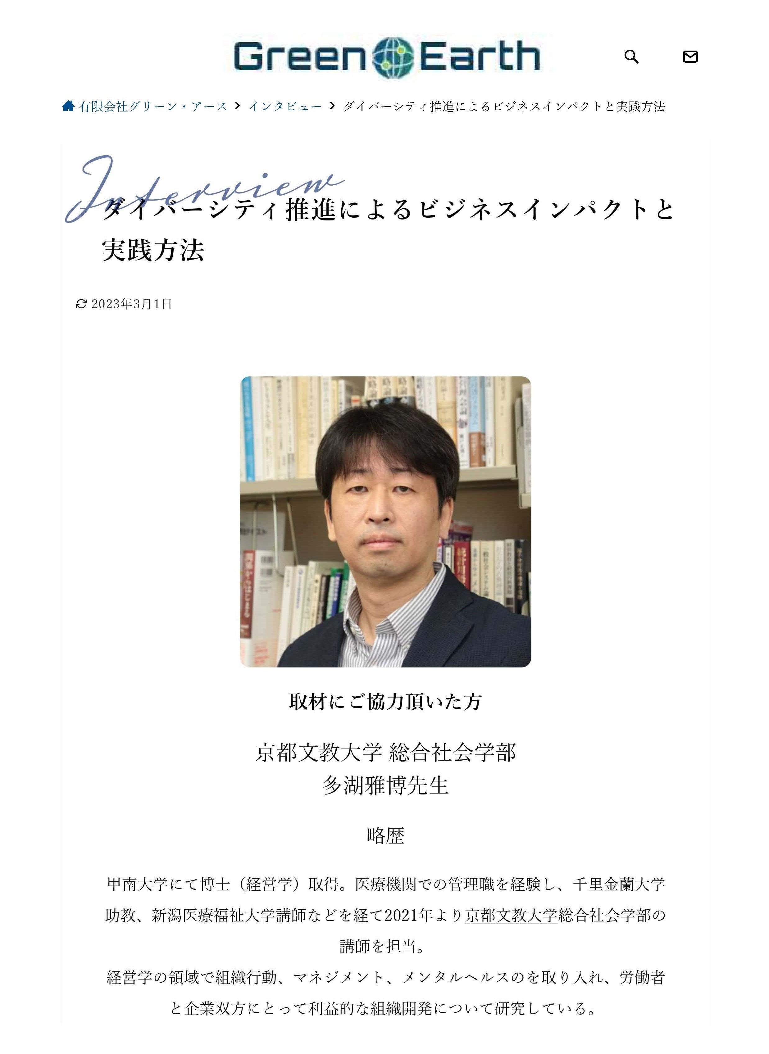 その他有限会社グリーン・アースのウェブサイトに多湖 雅博先生(総合社会学部講師)のインタビュー記事が掲載されました!