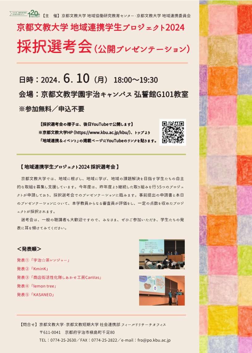 その他【参加募集】京都文教大学地域連携学生プロジェクト2024採択選考会(公開プレゼンテーション)の開催について