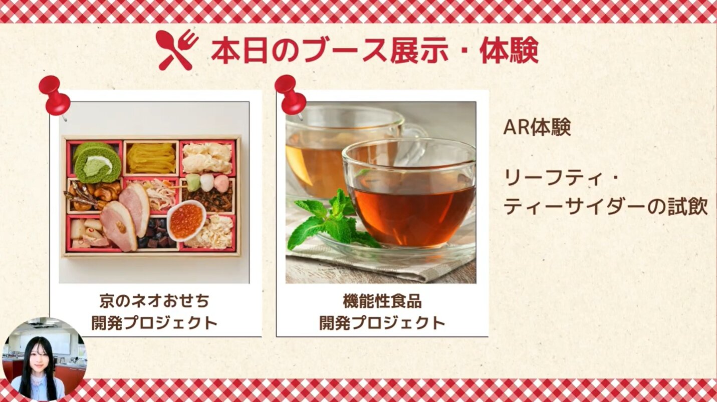 展示ブースでは、食マネジメントコースの地域連携の取り組みを実践事例として紹介します。地域社会のより豊かなwell-beingの実現に貢献できる人材の育成を目指した本学の文理融合型の取り組みを業界関係者の皆様に認知いただき、様々な業種の皆様との交流を行えたらと考えています。